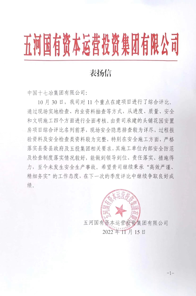 11月17日,中国十七冶集团有限公司收到五河国有资本运营投资集团有限公司发来的表扬信,对市政分公司承建的五河县花园安置房项目在五投集团十一个重点在建项目的综合评比中名列前茅给予表扬。