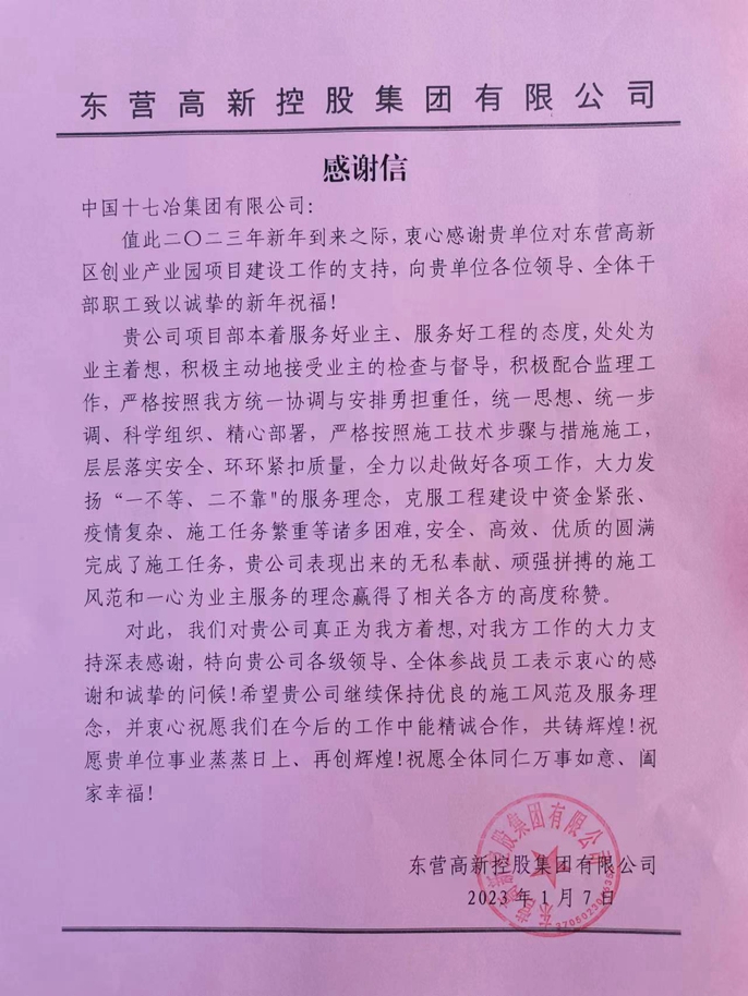1月7日,东营高新控股集团有限公司向中国十七冶发来感谢信,对东营高新区创业产业园项目部在工程建设期间所作贡献表示高度肯定并致以衷心感谢。