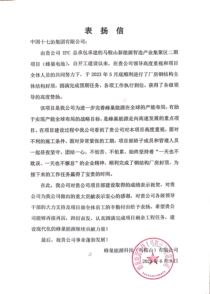 蜂巢能源科技(马鞍山)有限公司向十七冶致表扬信