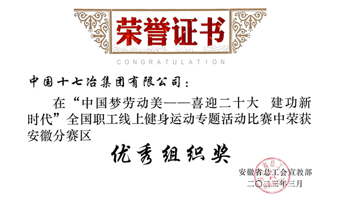 日前,从安徽省总工会获悉,在“中国梦·劳动美——喜迎二十大 建功新时代”全国职工线上健身运动专题活动比赛中,中国十七冶集团荣获安徽分赛区优秀组织奖,冶金分公司职工张来进荣获个人排名奖三等奖。