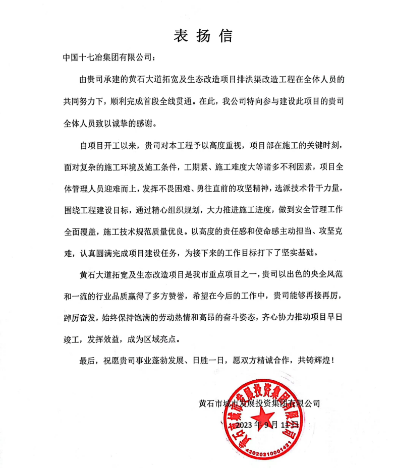 9月11日,黄石市城市发展投资集团有限公司向中国十七冶集团致表扬信,对黄石大道拓宽及生态改造工程项目部克服重重困难、顺利完成排洪渠首段全线贯通施工任务表示感谢和赞赏。