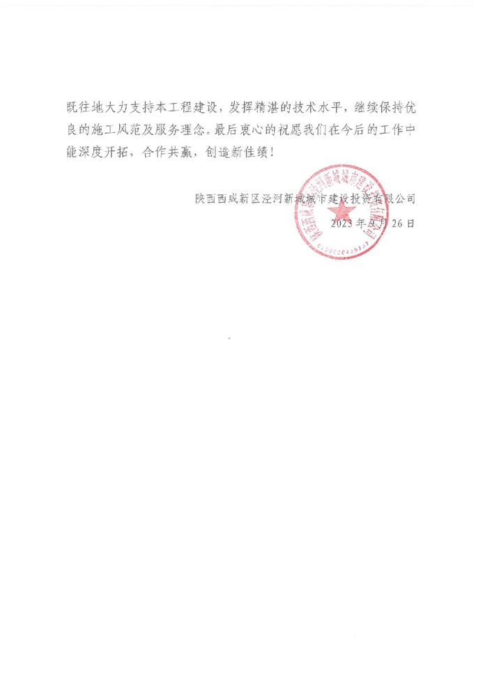泾河新城城市建设投资公司向十七冶致表扬信