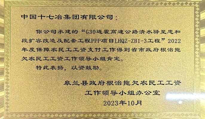 10月9日,兰州市皋兰县政府根治拖欠农民工工资工作领导小组办公室向中国十七冶集团授牌表彰,对G30连霍高速LHQZ-ZB1-3、LHQZ-ZB1-4项目团队保障农民工工资支付工作受国务院考核组肯定给予表扬。
