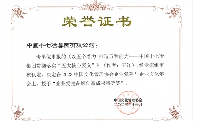 11月24日,从2023年度党建与企业文化建设年会获悉,公司获评“新时代党建+企业文化先进单位”。公司党建研究理论文章《坚持“六个聚焦”,以高质量党建引领企业高质量发展》获评为党建强企优秀案例特等奖、《以五个着力 打造五种能力——中国十七冶集团贯彻落实“五大核心要义”》获评为企业党建品牌创新成果特等奖、《铸就精品工程,唱响炼钢精炼国家队最强音》获评为“最美品牌之声”银奖代言作品、《诚信社会重守责 客户满意保开学》获评为“最美责任之声”银奖代言作品、《从“借船出海”到打造国际化高端品牌》获评为“最美先锋之声”银奖代言作品。