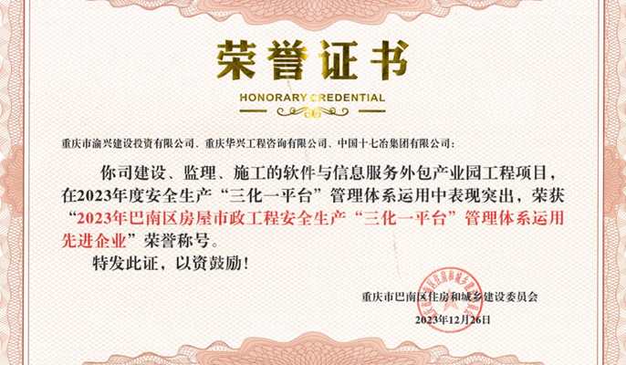 近日,重庆市巴南区住建委公布“2023年巴南区房屋市政工程安全生产‘三化一平台’管理体系运用先进企业”名单,中国十七冶西南分公司承建的重庆软件园项目榜上有名。