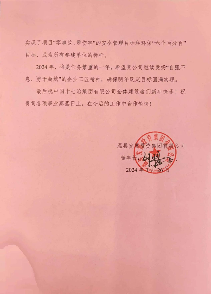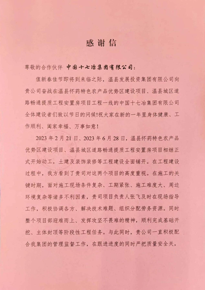 1月26日,温县发展投资集团有限公司向中国十七冶集团有限公司致感谢信,对中国十七冶积极配合业主工作、实现承建项目高质量履约所做出的重要贡献表示衷心感谢。