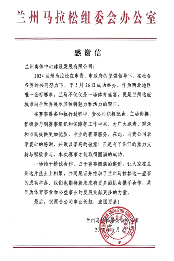 5月27日,兰州马拉松组委会办公室向兰州奥体中心建设发展有限公司致感谢信,对项目公司积极参与赛事组织保障工作,为广大跑者、观众和市民提供更加优质、专业的赛事服务致以诚挚感谢,给予高度认可。