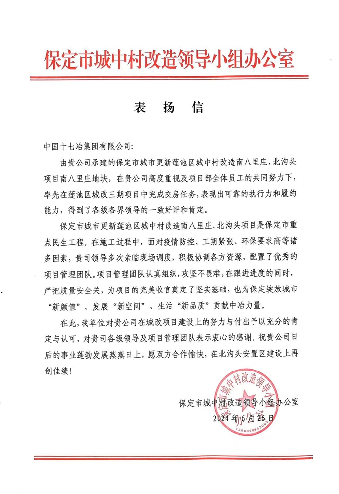626日,保定城中村改造领导小组办公室向中国十七冶集团表扬信,对房屋分公司保定市城改七标段团队在莲池区三期项目率先完成交房任务,表现出可靠执行力和履约能力给予好评和肯定。
