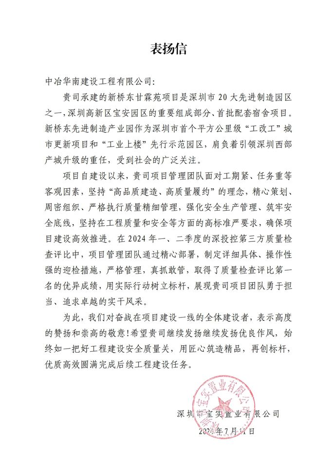 近日,深圳市宝实置业有限公司向中冶华南建设投资有限公司致表扬信,对新桥东片区城市更新片区项目——甘霖苑项目部在2024年一、二季度第三方质量检查评比中取得第一名的优异成绩给与肯定。