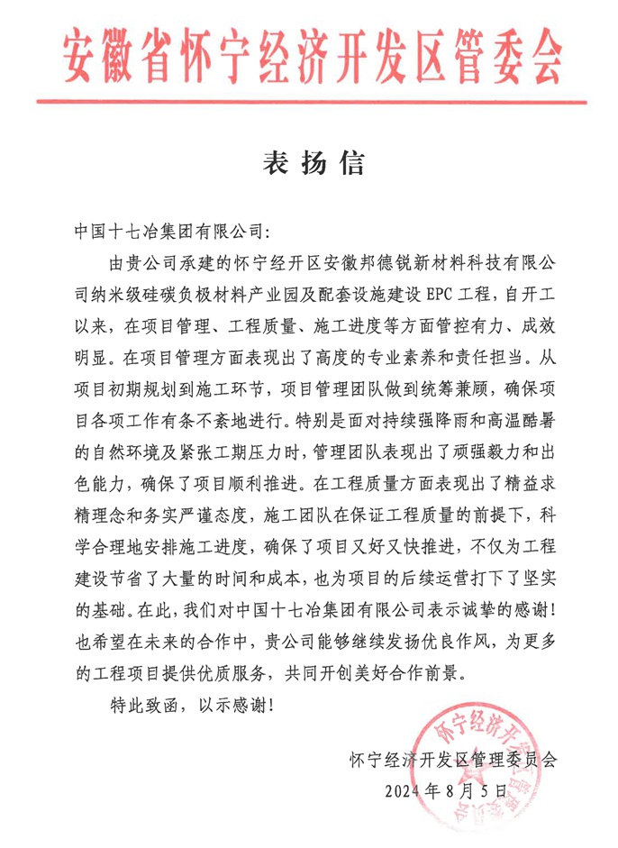 近日,怀宁经济开发区管理委员会向中国十七冶集团致表扬信,对房屋分公司安徽邦德锐项目团队在项目管理、工程质量、施工进度等方面表现出的专业素养和责任担当给予肯定。