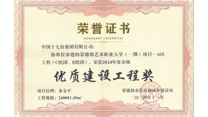近日,从景德镇市住房和城乡建设局获悉,中国十七冶承建的景德镇艺术职业大学(一期)项目A区工程(C组团、E组团)荣获2024年度景德镇市级优质建设工程奖。