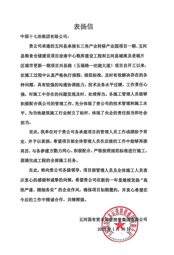 近日,五河国有资本运营集团向中国十七冶集团致表扬信,对市政分公司五河片区项目团队在沟通协调、技术水平等方面表现出的专业素养和责任担当给予肯定。