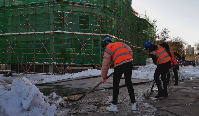面对恶劣天气,项目部立即启动应急预案,安排值班人员坚守在安全生产最前沿。8日清晨,暴雪红色预警信号解除后,项目部第一时间开展积雪清扫工作,大家不惧严寒,手挥铁锹,拿起笤帚,你一锄我一铲,全力保障人员进出行走,做到地上不滑、脚下有路。项目部院内,施工现场入口处,地库旁……做到扫雪除冰工作无死角。