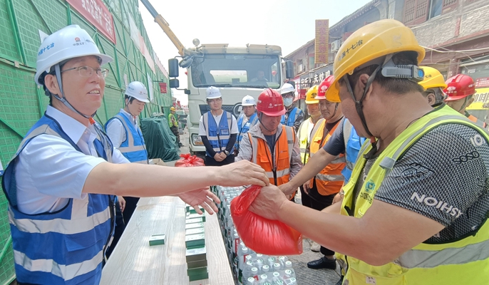 烈日炎炎,酷暑难耐。为保障一线员工身心健康,推动防暑降温工作落实落地,6月25日,中国十七冶交通分公司到河南洛阳老城区项目开展“情系一线、夏送清凉”活动,慰问在高温天气坚守岗位的一线职工,为他们送上一丝夏日清凉。